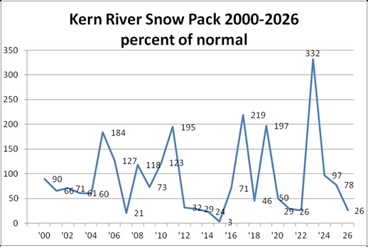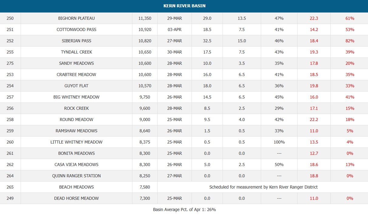 Fishing Report - 03/25/26 The recent and ongoing record high temperatures are having a dramatic change in our expectations for our namesake river for 2026. Just three weeks ago our snow pack was near normal and it has dramatically dropped. It appears peak runoff is happening two months early and the snow pack is less than half of normal before the latest course measurements are taken. This means that the high elevation snow packs are scant and they are crucial to keep the Upper Kern River 20 mile stretch below 70 degrees most of this summer. The low flow section will be +70 degrees daily for the whole summer. At this time our model shows that the runoff will end very soon and there will be no long term banking of trout plants like the last two years. We do not expect exceptionally good catching post runoff and the CDFW likely stop stocking the Kern River around Memorial Day as river temps rise above CDFW temperature criteria. The Southern Sierra snowpack is trending well below normal (see graph below). The March warming trend bodes well for panfish and bass in local lakes and ponds. There is a big trout derby at Lake Isabella March 28-30 with 500 tagged trout and $60,000 of prizes awarded to lucky anglers. Check it out here https://www.kernrivervalley.com/isabellalakefishingderby Flows on the Lower Kings, Upper and Lower Owens are ramping up fast and making wade fishers seek safer still waters until the melt has run its course. We will update all Cali waters when the April 1st snow pack data is tallied next week.