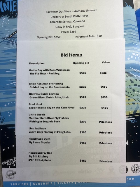 Proceeds go to a great cause Casting for Recovery www.castingforrecovery.org The event will be at the Maya Cinema 1000 California Avenue in Bakersfield, CA doors open at 1:00 pm. Great thing to do on a rainy day. Tickets online at https://www.flyfilmfest.com/bakersfield-ca/ Watch Preview video here https://vimeo.com/893876264 Here is a list of the seven guide trips (Kern River, Lower Sac, Colorado, Green River,UT) and more up for silent auction at the event Saturday. See you there. Many thanks to our sponsors Adventist Health Bakersfield and Kern River Fly Fishers Fishing Report - 12/21/23 Catching on the Upper Kern has dropped way off as is typical for the beginning of winter. Rain events are well behind normal for the start of the new snow pack season for the Southern Sierra. That has made for gin clear water but river temps are now in the low 40's on the 20 mile section and lower above Johnsondale Bridge. Trout are barely feeding on tiny midges below size 20 above and below the surface early afternoon. Plantings are happening but catching has been more hit than miss. Some of our best KRFF experts fishers are happy to get a hook up on a trip. This likely will be the case for the next two months. Precipitation is occurring as I type, so flows are about to rise and murky conditions to follow it would seem. Flow diversions at Fairview Dam by SoCal Edison have left section 5 very low under 50 cfs and that will continue to hurt fish populations there where most of us like to fly fish. Above and below section 5 flows have hovered around 400 cfs but will be climbing as the latest storm hits this week. In Bakersfield CDFW trout plants have happened at Riverwalk Lake and Lake Ming once a month which is a far lower frequency than the weekly plants between November and March we used to receive before Covid happened. The Lower Kern is not seeing any plants at all and flows continue to be well above levels of the last few years in December. In contrast the Lower Kings has been planted weekly and members fishing there are finding double digit catching and trout widely disbursed along the catch and release stretch as well as the put and take stretch above Alta Weir up to Pine Flat Dam. Tiny flies are not required and general nymph patterns to size 12 are hooking lots of rainbows. Flows there have been steady around 300 cfs on a very wide stretch of river. 2023 was a historic year for our region. The was an immense snow pack that made river wading dangerous for most of the summer and spring. Major destructive flooding occurred and rivers were reshaped, scoured river bottoms and dumped huge loads of silt into Lake Isabella and the inlet end of the lake that the Kern River feeds. Sadly, at last count over a dozen drownings occurred in 2023. Below are some graphs that show the unprecedented conditions of 2023. Fishing Report - 11/28/23 The excellent fall fishing has regressed to more winter like catching as water temperatures have dropped on our local waters. The catch rates on the Upper Kern are way lower than two months ago and the river is in the 40's now. The low flow section between Fairview Dam and the KR3 power house (section 5) has been below 50 cfs for weeks. This makes for poor sustainability for trout that are easy prey from natural predators and fishermen alike and migration is severely impaired to allow planted trout to move into deeper pools. Trout planted in the low flow stretch are easy to harvest and depopulates the wild trout as well. We have partnered with the Kern River Boaters to pressure SoCal Edison to increase minimum flows to 200 cfs to sustain this long stretch that has been severely impacted by repeated droughts. Fishing above Fairview Dam and below KR3 to Lake Isabella is more difficult to wade and finding holding water at +400 cfs. Below Lake Isabella flows are still high above 800 cfs and is not being stocked. We did get a plant at Riverwalk but the catching didn't last long. Lake Buena Vista had a trout derby and a large number of big rainbows and lightning trout have been caught out there. The best news is that the bigger trout are back in the Lower Kings River again. It is reported that CDFW plants of super-catchable (+19”) rainbows are making anglers happy. We are planning an outing there soon. Flows are around 300 cfs on this wide river below Pine Flat Reservoir . Precipitation has been well below normal in San Joaquin Valley cities since October and precipitation levels have been almost half of normal for this time of year. There is no rain forecasted in the foreseeable future - something to keep an eye on. Will we really have an El Nino year in 2024? Fishing Report - 11/10/23 Had a great day of fishing on the Upper Kern today, however, the catching was a different matter. So the fishing was great because the river was clear, no wind, leaves are changing and the mountains were clear in the distance. My casting got better but we were both skunked (can't remember being skunked in early November on 20 miles of river). We tried 8 different spots and did not see a rise anywhere and didn't even get a grab on dries, nymphs or streamers. We arrived at 9 am and the water was 50 degrees and air temps hit freezing before sun up. Flows on the stretch between Fairview Dam and the KR3 powerhouse (Section 5) are extremely low at 48 cfs. This makes trout very susceptible to predatory birds and keeps trout from migrating up river to find deeper holes to hide. On sections 6 (above Fairview to Johnsondale Bridge) and section 4 (below KR3) flows are still quite high for wading and holding water was not easy to find. There has been no stocking in October and a call to the CDFW revealed it will be stocked during November. The planting website shows it should have been planted this week. If it was we did not see any evidence the Upper Kern was planted on sections 4,5 or 6. We talked to baiters and fly anglers and also observed others and did not see any one hook up or a stringer with a tro