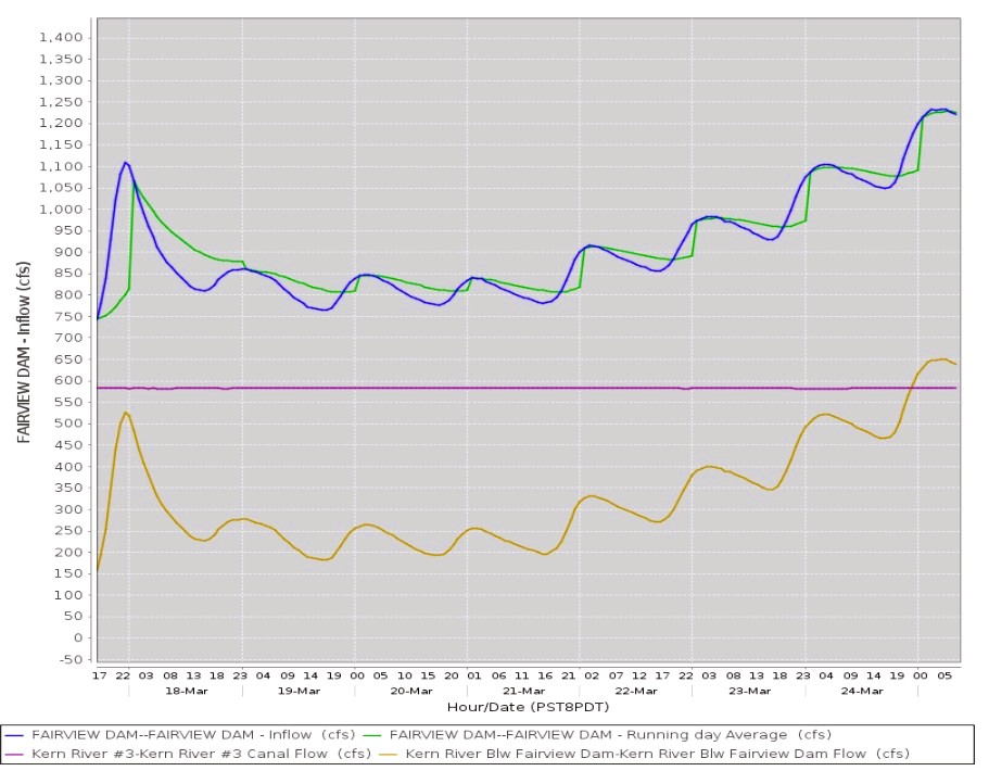 Summer is here. Triple digit weather is forecast for the next 2 weeks. On the Kern River the runoff is ramping down and peak flows are behind us. We wait until the low flow section drops well below 400 cfs to wet a line and avoid any stretch of the 20 miles of river that exceeds that. We expect flows to reach that level soon on Section 5. July likely will be very good. Typically when the metering stations record 1,000 cfs in Kernville we’ll try section 5 (below Fairveiw Dam to KR3 powerhouse) IF 600 cfs is being diverted for power generation. Then you must be aware if flows are dramatically changed for maintenance or other reasons for reduced power diversions. Always check the flows before you go https://www.sutronwin.com/scedison/tw/jsp/ There have been 335 drownings since 1968 (10 last year) so don’t be tempted to wade the river in unsafe conditions no mater how good the fishing is reported to be. Something unusual is going on at Fairview Dam as flows are ramped up daily according to the flow graphs. Power diversions have been reduced, putting more water onto section 5. Flow on 11 miles of river we normally target as flows become more safe to wade are rising + - 300 cfs every day. See gold lines on the graph below. Until flows stabilize under 400 cfs on the “low flow” stretch (CDFW section 5) we avoid wading the Upper Kern River. We aren’t there yet and it will be important to monitor the flows before you make the trip up to the Upper Kern River. If you happen to be on the west side of the Upper Kern on section 5 you may have a very long walk to safely wade back across to the road side when flows are increased without warning. One of the requirements we would like to see in the future is that SoCal Edison must report flow changes they intend to implement to make the Kern River safer. We are well aware of the hundreds of drowning deaths on our namesake river over the past few decades. Communicating flow changes ahead of time would potentially save lives. If and when Upper Kern flows on section 5 stabilize below 400 cfs we will give it a try and report. Stay tuned..... Still water catching has been good for members at BVS and Lake Isabella. The crappie, bluegill and bass action is on. These species are aggressive with the current water temperatures. Lake Isabella is 67% full and quite a bit lower than nearly all of the other large Sierra reservoirs in CA. This is another indication that our Kern River snow pack was much lower than estimated on April 1st. High altitude tributaries have been good for stealthy anglers willing to drive an hour beyond Kernville. The Kern River above Johnsondale Bridge is still very high to safely wade where most trout are lying. The Lower Kern is very high as water demands in the valley will drive high flows for months. Fishing Report - 05/31/24 The later part of the spring season is here. On the Kern River the runoff is still ramping up and peak flows are likely still to come. There are some indications that the Southern Sierra snow pack dropped faster than anticipated as it is now 26% of normal for this date. As you recall we were at 97% of normal on April 1st so levels dramatically dropped in what has been a cooler than normal spring. Likely quite a bit of sublimation may have occurred in the Kern River watershed in 2024. Time will tell. For now Upper Kern flows are above 2,000 cfs and not safe to wade. We wait until the low flow section drops well below 400 cfs to wet a line and avoid any stretch of the 20 miles of river that exceeds that. We expect July likely will be good. Typically when the metering stations record 1,000 cfs in Kernville we’ll try section 5 (below Fairveiw Dam to KR3 powerhouse) if 600 cfs is being diverted for power generation. Then you must be aware if flows are dramatically changed for maintenance or other reasons for reduced power diversions. Always check the flows before you go https://www.sutronwin.com/scedison/tw/jsp/ There have been 335 drownings since 1968 (10 last year) so don’t be tempted to wade the river in unsafe conditions no mater how good the fishing is reported to be. Upper elevation tributaries of the Kern are a good place to catch right now. Still water catching has been good for members at BVS and Lake Isabella. The crappie, bluegill and bass action has kicked in. These species are spawning and aggressive with the current water temperatures. Lake Isabella is 70% full and quite a bit lower than all of the other large Sierra reservoirs in CA which are nearly full at this time. It is doubtful that Lake Isabella will get near capacity this year. This is another indication that our Kern River snow pack was much lower than estimated on April 1st. Fishing Report - 04/05/24 Spring conditions are rapidly changing the dynamics of our local waters. Some summer like temperatures recently have triggered the melt cycle for 2024. Catching has been great for KRFF members on the Lower Kings with +5 lb rainbows landed by members and +50 landed per day but flows are now much higher. Runs that were fairly serene are now hard to find. Quiet water and easy wading likely has gone away as water demands rise. At this time the Lower Kings has ramped up close to 1300 cfs and will go much higher. So the great fly fishing there has come to an end until November. Likewise the Upper and Lower Kern River are becoming much more difficult to safely wade. Stocking abruptly was stopped Feb 24 according to the CDFW website. What was the reason? The trout at the San Joaquin hatchery were too undersized to plant which accounts for the lack of catching the last month. The CDFW expects to resume planting some time in April but it seems they will be on the small side of what we normally see. For now the treasured safely wadeable serene pocket water likely won't return until summer. How long with the 2024 runoff off last? More on that later. So what is in store this summer and fall for our namesake river? The benchmark snow pack measurements o