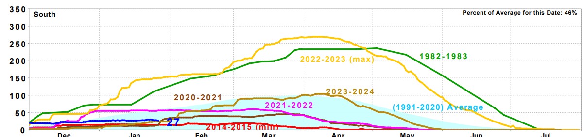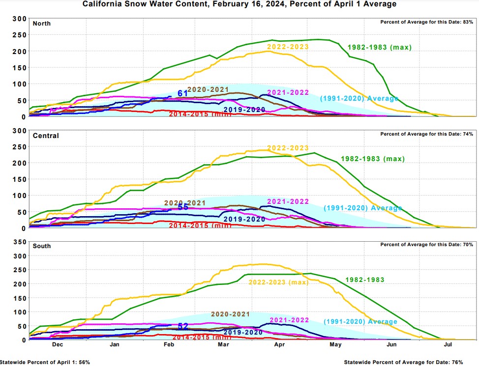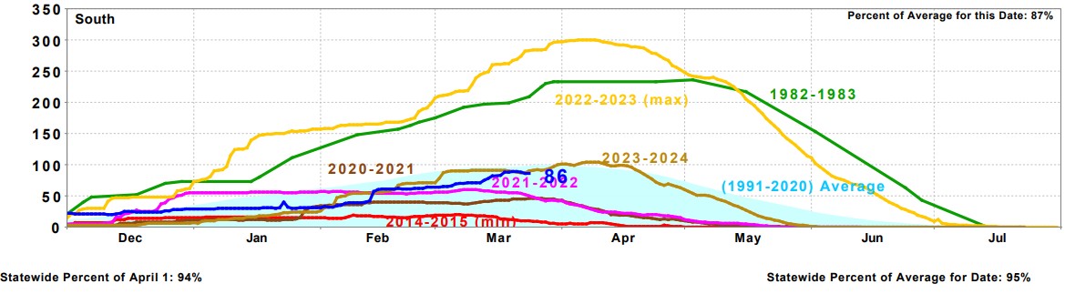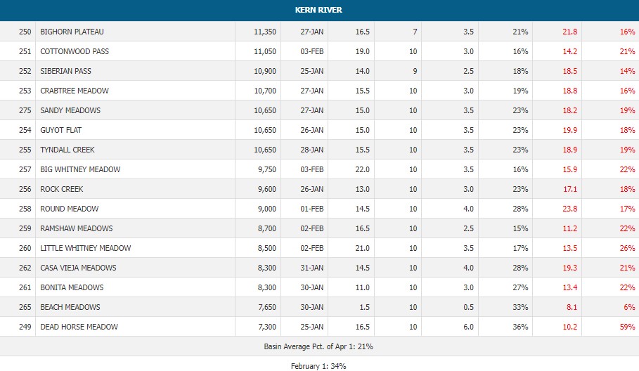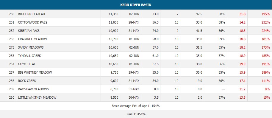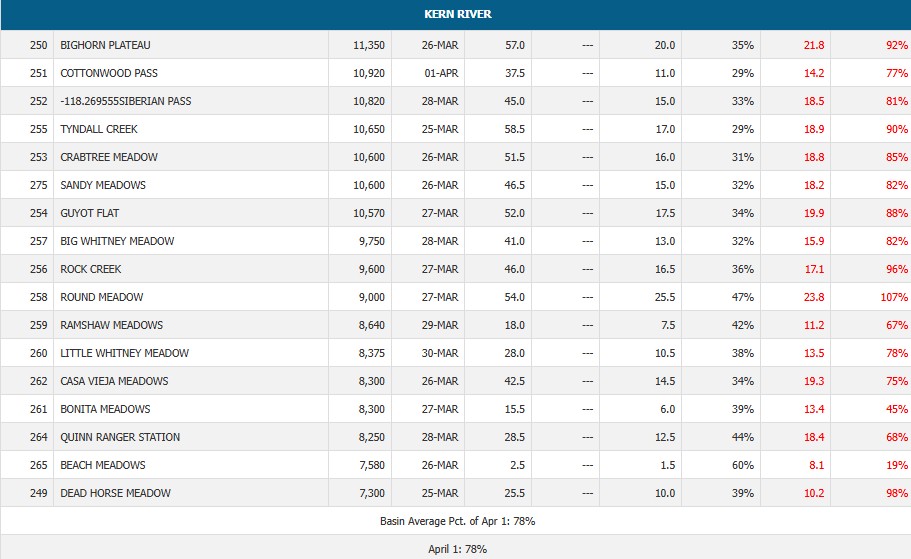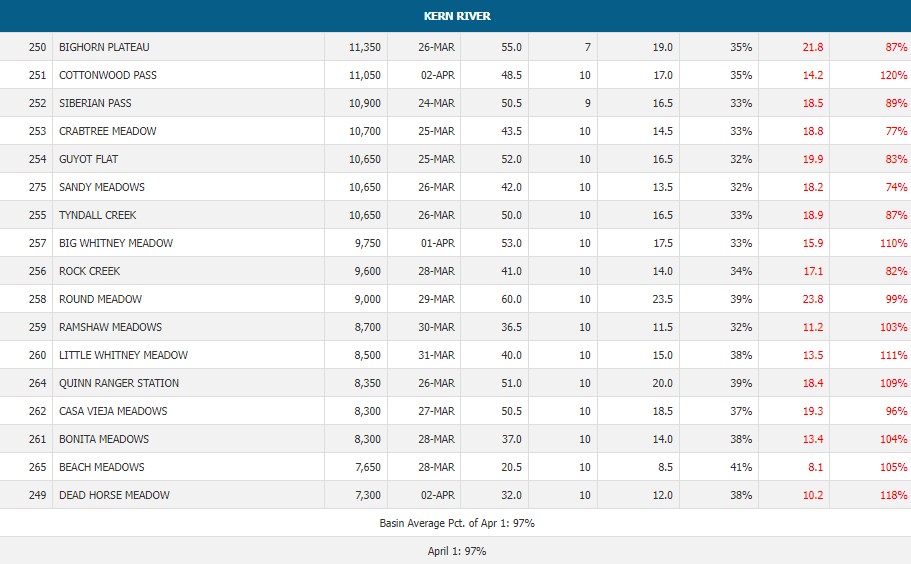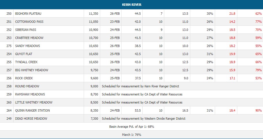 So how do the rest of California river system snow packs stack up for 2024? Well the further north you go the better the snow pack levels. Below is a sampling of favorite trout rivers in the state. KERN 97% STATE OVERALL 106% You can look at all of the data here https://cdec.water.ca.gov/reportapp/javareports?name=COURSES