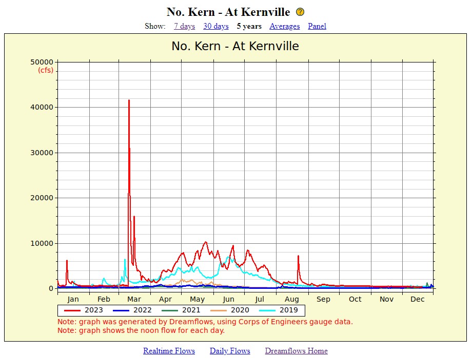 River Update - 05/05/23 Effective Thursday, Tulare County Sheriff Mike Boudreaux has issued temporary river closures for parts of the Kaweah, Kern, and Tule Rivers. Sections of the Kern River within Tulare County at all points along the Kern River beginning at Dry Meadow Creek, approximately two miles east of the Johnsondale Bridge, down to the Tulare/Kern County Line. The closure order would include all river access locations for recreational use See more details at link below: Apparently there are already closures for parts of the Kings & St. Johns rivers in Tulare County as well. Fishing Report - 04/27/23 It appears certain that the historical snow pack of 2023 will be driving California fishing conditions for all of this summer. Fortunately for Bakersfield residents and other San Joaquin Valley cities temperatures have remained below normal for months holding back the huge run off to come. This has given water managers the time to drain flood control reservoirs before they will fill fast and spill over. Summer temperatures are on the way and the great runoff of 2023 is about to begin. The North Fork of the Kern River is flowing +6,000 cfs and climbing fast as I type. The South Fork is 1,500 cfs. I have collected snow pack data and run off flow data for over 20 years and have been able to predict within one week of when flow conditions become wadeable after the dangerous snow melt flows of summer. When flows drop below 1,000 cfs in Kernville and the 16 mile section between Fairview Dam and the KR3 Powerhouse are diverting 600 cfs for power this low flow section (400 cfs) has the best catching of the year. Why? The river is continuosly stocked by the CDFW for weeks or months and trout are swept down river and disbursed all over the river. They aren’t dumped in just a few well known spots and completely harvested in a weekend like most of the year. The first three weeks after flows drop below 1,000 cfs (measured at Kernville) trout are disbursed throughout the river and pocket water is wadeable making the catching prime. Hooking 10 trout/hr is commonplace for those who can wade aggressively from pocket to pocket covering a mile of river in an afternoon. So when will this happen? With a peak April 1 snow pack of 332 % of normal my regression analysis says we will see 1,000 cfs around September 15. There are few snow packs seen this large so prime time may happen earlier or later, but I am confident wading the Upper Kern won’t be safe until after Labor Day. In the mean time Lake Isabella should be pretty good this year for carp, bass and crappie but lake levels will rise fast over the next few weeks. Fly fishers will probably have to adjust where they go and how deep the pan fish are every week as the lake rises fast and is drained fast to avoid down river flooding in San Joaquin Valley cities. Upper elevation tributaries will thrive but access to them may not be possible until July 4th. The road to Johnsondale is still closed above McNallys. The NFS does not know when it will be repaired.