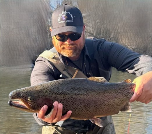 At noon the water temp on section 5 was 48 degrees and a very light hatch of BWO was beginning. I did not see one car in the pullouts, nor a fisher at Riverside Park, nor any tents in the campgrounds on a Friday afternoon? My guess is between the rain predicted and the catching has been so poor for so long most have given up. That was good for me because I had a lot of river choices all to my self. I set up my hopper dropper with a fresh Red Hooked BH Arnerd that was freshly tied yesterday at the KRFF club tying party last night. I bounced around some likely spots that might hold trout. After some searching I landed my first bow – an 18” stout planter. This was the size of the trophies that likely were planted this week. A trophy is defined by the CDFW as a trout 3lbs or more. I think this one qualifies.