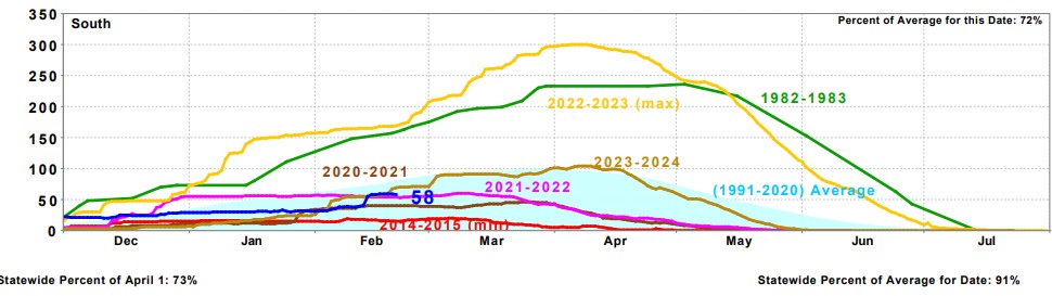 The Lower Kern is getting some plants this week and local lakes have been getting rainbows. No reports from club members on how the catching has been. A lot of big rainbows and lightning trout were harvested from Riverwalk Lake for Cope’s Trout Derby for the kids. This is a great event to get the next generation fishing in our town. Also, a 5 lb large mouth was caught and released during the derby as well. Warmer waters are ramping up the bass and panfish bite on local lakes. The snow pack is beginning to look very poor for this summer even with one big storm in February that pounded NorCal (should be a good water year up there). At this time the Southern Sierra snow pack is about 58% . There is no significant precipitation on the near term horizon. Drought conditions for 2025 appears likely. If this occurs low flows below Fairview Dam kept artificially low by SoCal Edison will mean trout lethal 80 degree water temperatures most of the summer. This is far too little water for trout health on 16 miles of river. We hope to persuade SoCal Edison to raise minimum flows.
